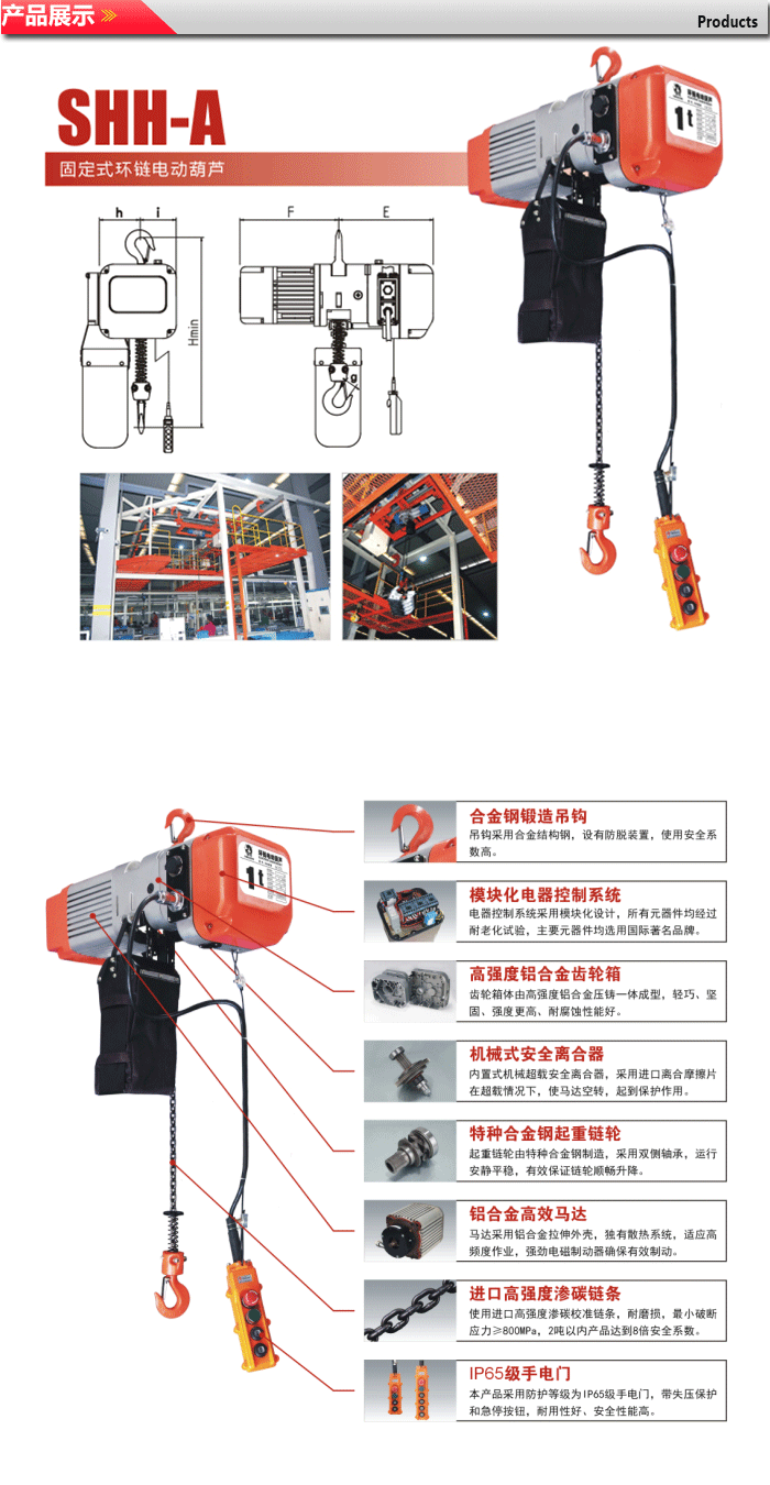 3、零部件強度高本機主要零部件均采用高級合金鋼材料,并經多道特殊熱處理工藝加工,具有強度高、耐磨性好等特點;上、下吊鉤采用高強度合金鋼制作,經強化熱處理后具有很高的韌性,即使機體因超載引起破壞,吊鉤也只會產生朔性變形而不會發生脆性斷裂。
